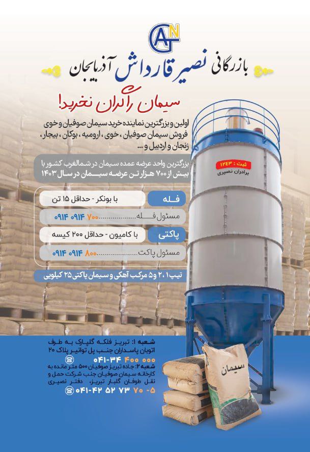 بازرگانی نصیر قارداش آذربایجان اولین و بزرگترین نماینده خرید سیمان صوفیان، خوی، ارومیه، بوکان، بیجار، زنجان، اردبیل